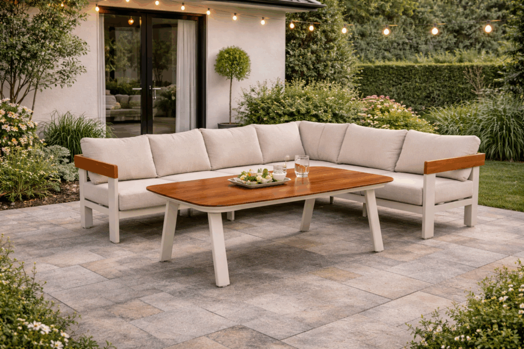 The Molto corner sofa set is an invitation to spend time together in the garden or on the terrace, where meals become conversations and gatherings naturally evolve into relaxation. The simple, modern design perfectly complements the aesthetics of contemporary terraces and gardens, creating a cohesive, elegant whole that doesn’t dominate the space but naturally complements it.
